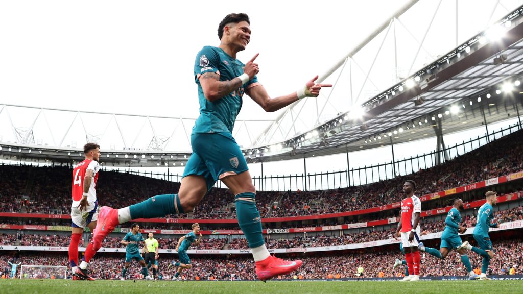 Updated / Saturday, 3 May 2025 19:56Evanilson celebrates his winnerArsenal warmed up for Wednesday’s Champions League semi-final second leg at Paris St Germain with a shock 2-1 home defeat to Bournemouth.Declan Rice fired the Gunners ahead after 34 minutes but Andoni Iraola’s visitors staged a spirited second-half comeback at the Emirates.Dean Huijsen equalised in the 67th minute and eight minutes later Evanilson bundled in the winner to help Bournemouth complete a league double over the Gunners and boost their own faint European qualification prospects.Mikel Arteta revealed on Friday Arsenal’s new Premier League target was to finish second after Liverpool clinched the title last Sunday, but Manchester City’s victory over Wolves has closed the gap to three points.This fourth league defeat of the campaign means the Gunners face a potential battle for a top-five finish over the next month, but first is a midweek trip to PSG where they will aim to overturn a one-goal deficit to reach a second Champions League final.Despite the enormity of Wednesday’s fixture, Arteta made only two changes and one was enforced with Jurrien Timber not fit enough to be involved.Mikel Merino, recently a makeshift forward for Arsenal, also dropped to the bench, which allowed Rice the freedom to roam forward and he dragged the first chance of note wide after 15 minutes.Rice sent another effort off target minutes later before he winced not long after Gabriel Martinelli limped back onto the pitch following an excellent run.Both were fine to continue but the hosts’ were nearly hit with a sucker-punch in the 26th minute when Milos Kerkez produced a superb left-footed cross but Evanilson headed over from six yards.It was a gilt-edged opportunity which should have been immediately punished, only for Martinelli to scuff wide from the edge of the area, before Trossard saw a header stopped on the line by Cherries goalkeeper Kepa Arrizabalaga.Arsenal’s opener arrived three minutes later when Rice rounded Kepa before firing home his eighth goal of the campaign.The visitors responded strongly with a Justin Kluivert effort deflected behind before David Raya’s sloppy pass was almost punished but Evanilson chipped over.Arteta’s half-time message seemed clear as Arsenal targeted an early second goal but a close-range Bukayo Saka header hit team-mate Rice before another effort by the England attacker was straight at Kepa.Saka curled wide after he cut impressively inside Julian Araujo after 57 minutes before he teed up Martin Odegaard but the Arsenal captain ignored cries to shoot and was dispossessed on the edge of the area.It kept Bournemouth in the match and Iraola reacted after Kluivert smashed over with Alex Scott and Antoine Semenyo introduced with 25 minutes left.Semenyo’s first involvement was to ruin a counter-attack with a heavy touch but he made amends straight after when he created the equaliser with a long throw which was steered into the bottom corner by Huijsen.Merino was sent on for Rice in the 74th minute but the Cherries won it 60 seconds later when Alex Scott’s inswinging corner was flicked on by Marcus Tavernier and finished by Evanilson.More stories onRead Next